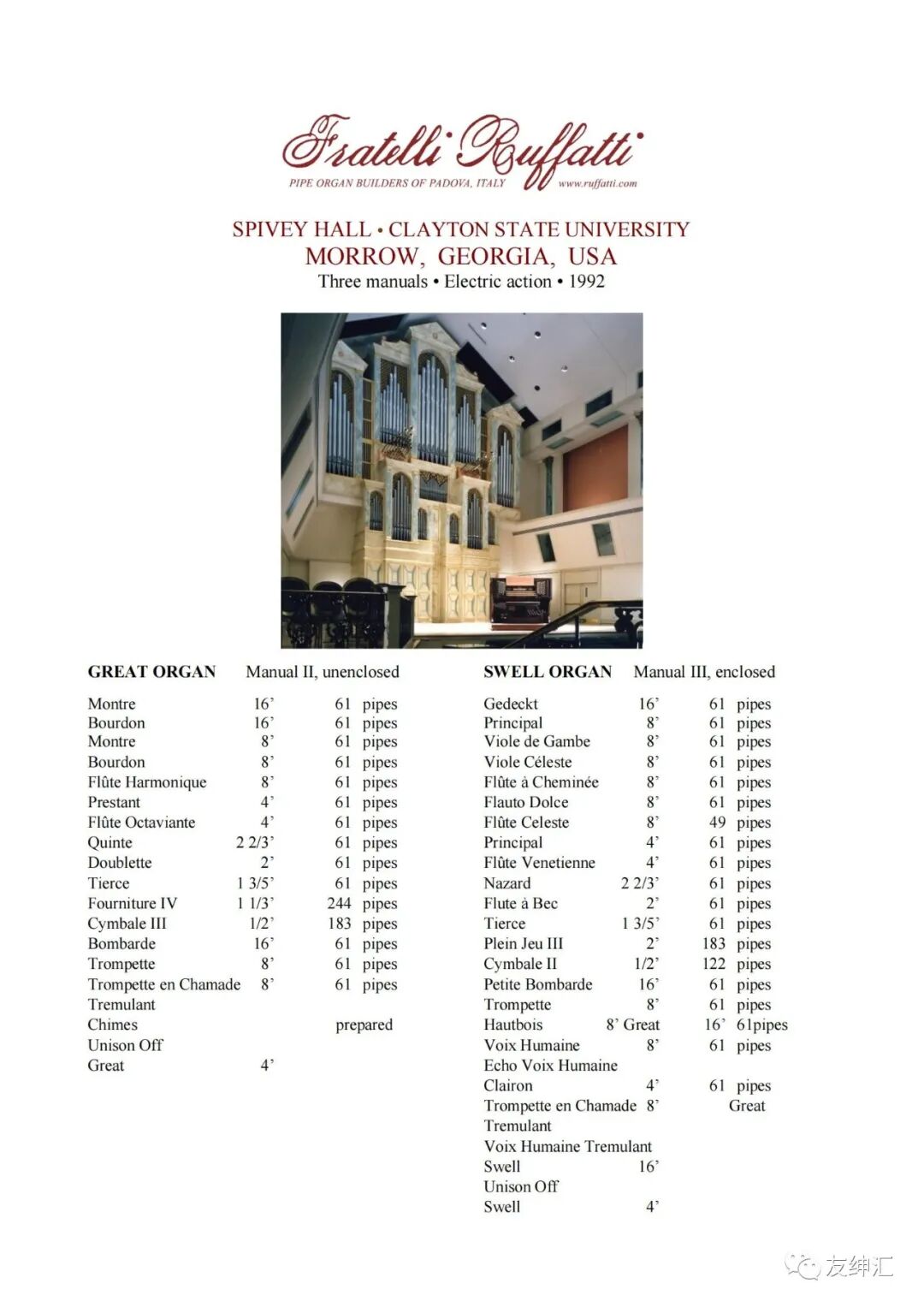 SPIVEY HALL • USA • Three manuals • 1992 作者 admin 在 Ruffatti 上海友绅文化传播有限公司 手机:18121026426 微信:unisoncc365 电子邮箱:ruffatti@unisoncc.com